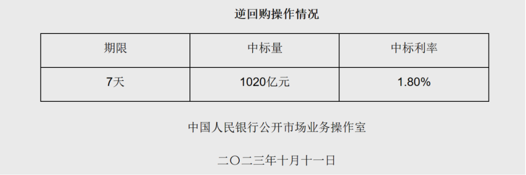 人民银行网站消息,为维护银行体系流动性合理充裕,人民银行10月11日以利率招标方式开展了1020亿元逆回购操作,中标利率为1.8%。
