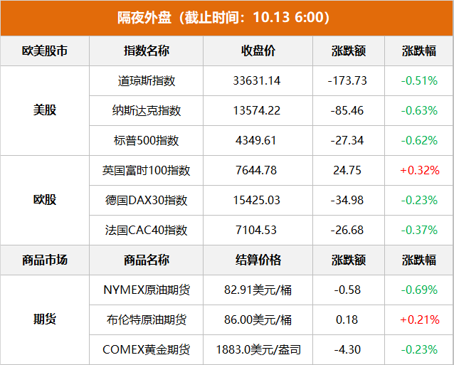 美股市场:美股三大指数集体收跌,截止收盘,道琼斯指数比前一交易日下跌173.73点,收于33631.14点,跌幅为0.51%;标普500指数下跌27.34点,收于4349.61点,跌幅为0.62%;纳斯达克指数下跌85.46点,收于13574.22点,跌幅为0.63%。继PPI之后,美国9月CPI也超预期增长,延续较前月加快增长的势头,9月核心CPI因住房成本高而环比增速持平8月,另一核心通胀指标——剔除住房的服务CPI环比增长加快至0.61%,创一年最高增速,凸显通胀粘性。CPI通胀意外继续回升,强化了市场对美联储要将高利率保持更久、以及今年内将再加息一次的紧缩预期。