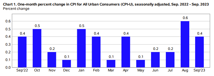 美国劳工部公布的具体数据显示,美国9月份季调后消费者物价指数(CPI)环比上升0.4%,高于市场先前预期的0.3%,8月时该数据上升0.6%;