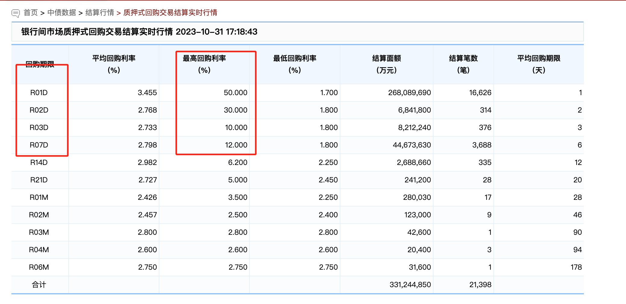 中国债券信息网实时行情显示,截至17:18分,银行间市场质押式回购交易品种中,R01D、R02D、R03D和R07D四款产品最高回购利率分别为50%、30%、10%和12%,为近年来罕见的阶段性高点。