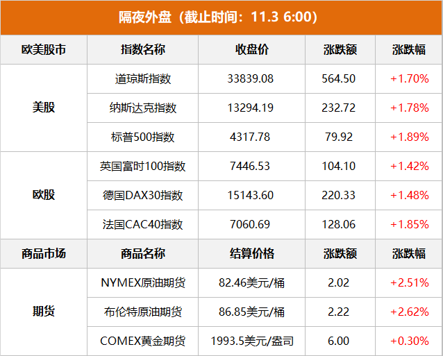 商品市场:国际油价上涨,纽约商品交易所12月交货的轻质原油期货价格上涨2.02美元,收于每桶82.46美元,涨幅为2.51%;12月交货的伦敦布伦特原油期货价格上涨2.22美元,收于每桶86.85美元,涨幅为2.62%。国际金价下跌,纽约商品交易所黄金期货市场交投最活跃的12月黄金期价比前一交易日上涨6美元,收于每盎司1993.5美元,涨幅为0.30%。