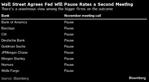 如下图所示,目前所有主要的华尔街投行机构,均预期美联储今晚将按兵不动。