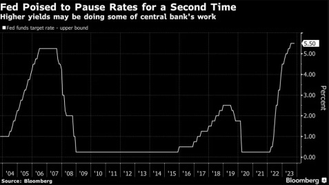 第一件事是金融环境的大幅收紧——“代表作”是30年期和10年期美债收益率的先后升破5%,而包括美联储官员在内的许多业内人士也由此认为,最近的收益率飙升可能已起到相当于美联储加息的效果,这降低了本次会议加息的必要性。