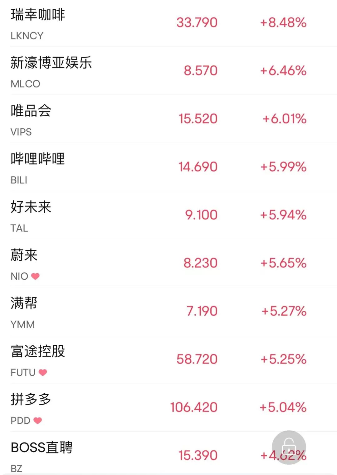 热门中概股中,蔚来涨超5%,拼多多涨5%,唯品会涨6.01%,哔哩哔哩涨5.99%,好未来涨5.94%,京东涨4.38%,小鹏汽车涨3.63%,腾讯音乐涨3.17%,理想汽车涨2.92%,百度涨2.44%,阿里巴巴涨2.28%。
