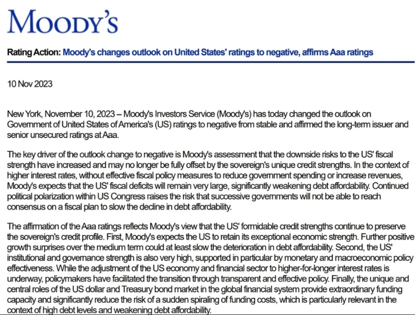 北京时间11月11日凌晨,美股盘后,穆迪公司评级突然宣布,将美国的主权信用评级展望从“稳定”下调为“负面”,不过依然维持Aaa的最高一档评级。