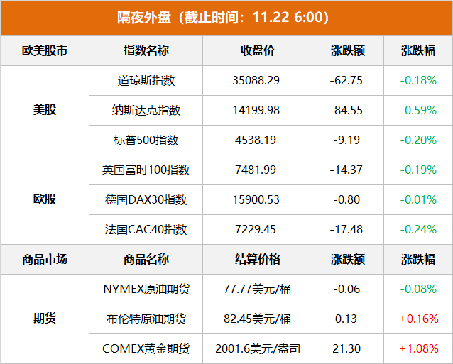 美股市场:美股三大指数小幅收跌,截至收盘,道琼斯指数收跌62.75点,跌幅0.18%,报35088.29点;纳斯达克指数收跌84.55点,跌幅0.59%,报14199.98点;标普500指数收跌9.19点,跌幅0.20%,报4538.19点。美联储周二发布了10月31日至11月1日的联邦公开市场委员会(FOMC)货币政策会议纪要。决策者认为,利率将在一段时间内保持限制性,在是否进一步加息的问题上应谨慎行事,保留进一步加息的可能性。美联储官员没有在会议纪要中给出降息的暗示。