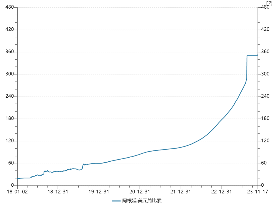 与通胀相对应的是阿根廷货币比索的大幅贬值。年初至今,阿根廷比索官方汇率大跌了近50%,至1美元兑350比索左右。