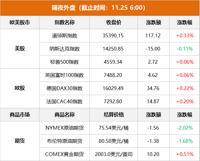 商品市场:国际油价感恩节后下跌,纽约商品交易所12月交货的轻质原油期货价格收跌1.56美元,跌幅2.02%,报75.54美元/桶;2024年1月交货的伦敦布伦特原油期货价格下跌1.38美元,收于每桶80.58美元,跌幅为1.68%。国际金价上涨,纽约商品交易所黄金期货市场交投最活跃的12月黄金期价上涨10.2美元,收于每盎司2003美元,涨幅为0.51%。