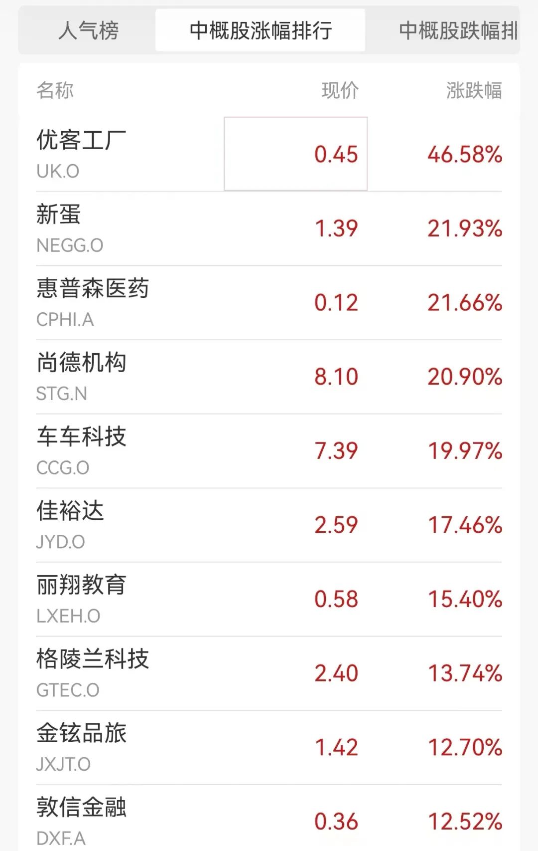 优客工场跌46.58%,领跌中概股。新蛋涨21.93%,盛丰物流涨10.27%,涂鸦智能涨7.33%,好未来涨5.26%,希尔威金属矿业涨4.34%。中概新能源汽车股全线走低,蔚来汽车跌0.49%,小鹏汽车跌3.97%,理想汽车跌5.11%。
