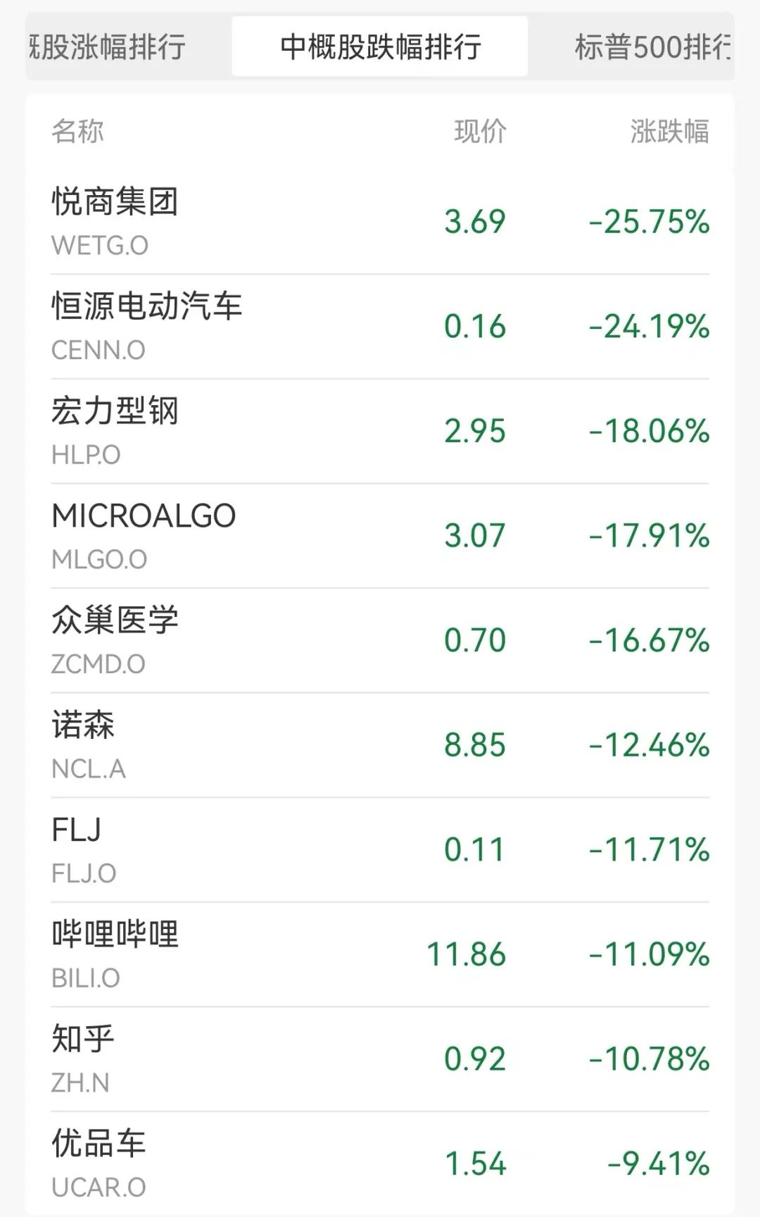 热门中概股普遍下跌。悦商集团跌25.75%,领跌中概股。哔哩哔哩跌11.09%,知乎跌10.78%,尚乘数科跌9.18%,叮咚买菜跌7.33%,亿航智能跌7.3%,嘉楠科技跌6.98%,亚朵跌5.15%,达达集团跌4.52%,华住跌4.28%。