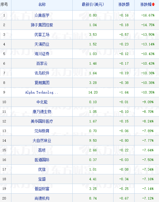 领跌中概股列表: