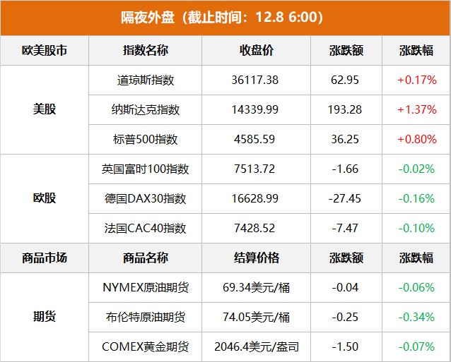 商品市场:国际油价下跌,截至当天收盘,纽约商品交易所2024年1月交货的轻质原油期货价格下跌4美分,收于每桶69.34美元,跌幅为0.06%;2024年2月交货的伦敦布伦特原油期货价格下跌25美分,收于每桶74.05美元,跌幅为0.34%。纽约商品交易所黄金期货市场交投最活跃的2024年2月黄金期价7日下跌1.5美元,收于每盎司2046.4美元,跌幅为0.07%。