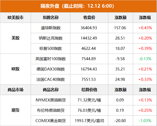 商品市场:国际油价上涨,截至当天收盘,纽约商品交易所2024年1月交货的轻质原油期货价格上涨9美分,收于每桶71.32美元,涨幅为0.13%;2024年2月交货的伦敦布伦特原油期货价格上涨19美分,收于每桶76.03美元,涨幅为0.25%。纽约商品交易所黄金期货市场交投最活跃的2024年2月黄金期价11日下跌20.8美元,收于每盎司1993.7美元,跌幅为1.03%。