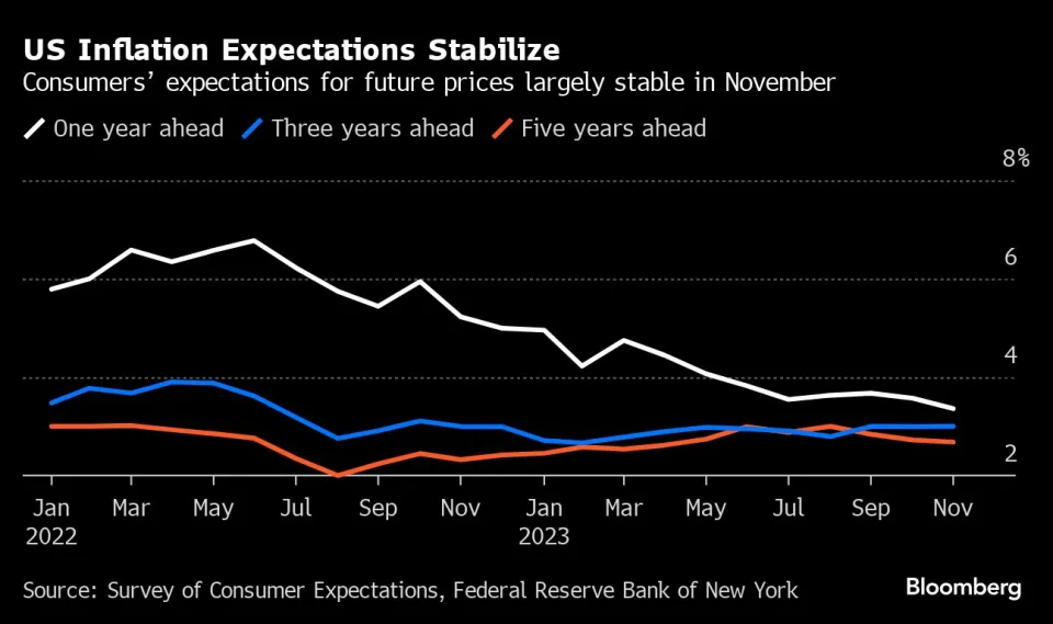 但需要指出的是,尽管核心通胀录得回升,但短期通胀预期却录得下降:纽约联储本周一公布的数据显示,11月美国消费者未来一年通胀预期为3.4%,降至2021年4月以来新低。对未来一年通胀率的预期中值连续第二个月下降,对三年和五年通胀水平的预期分别稳定在3%和2.7%。短期通胀预期的回落反映了一系列因素,包括汽油价格预期涨幅回落,对房租和大学学费价格的预期涨幅降至2021年1月以来新低。