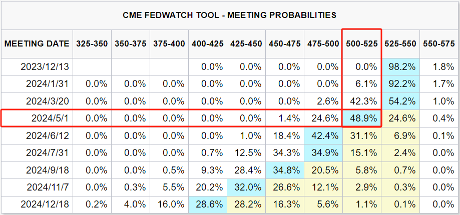 据芝商所“美联储观察”工具,11月通胀数据发布后,与美联储政策利率挂钩的期货合约迅速将美联储的首次降息时间提前到了2024年3月份,不过随后3月份降息的押注有所减少,截至发稿,期货市场认为首次降息要等到明年5月份。