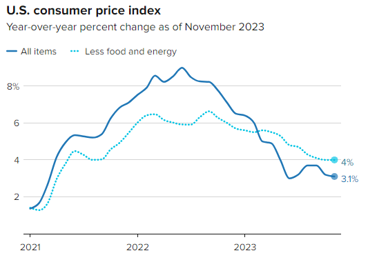 北京时间12日晚间,美国劳工统计局公布的数据显示,美国11月CPI同比上涨3.1%,较10月3.2%的增幅放缓,符合预期;不过,11月CPI环比增速升至0.1%,高于前值和预期的0%。