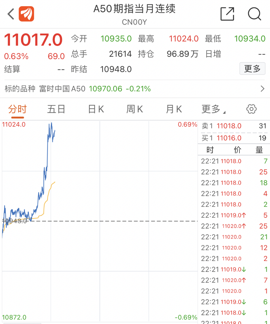 与此同时,富时中国A50指数期货亦直线拉升,现涨0.63%。