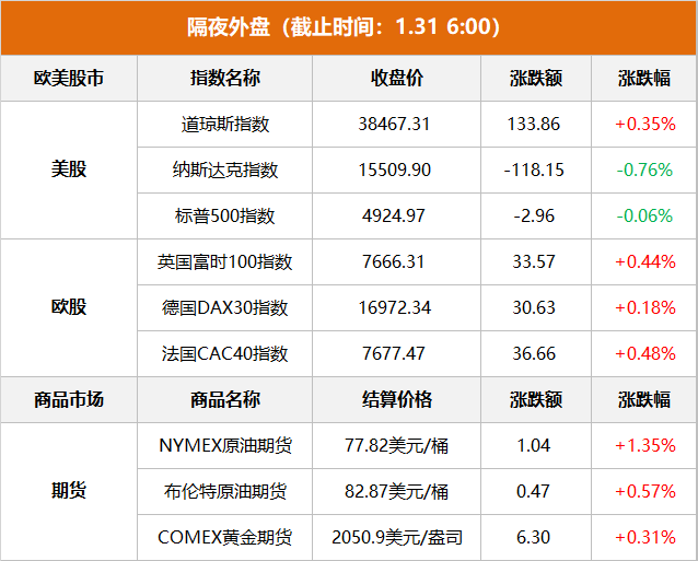 商品市场:国际油价上涨,截至当天收盘,纽约商品交易所3月交货的轻质原油期货价格上涨1.04美元,收于每桶77.82美元,涨幅为1.35%;3月交货的伦敦布伦特原油期货价格上涨47美分,收于每桶82.87美元,涨幅为0.57%。纽约商品交易所黄金期货市场交投最活跃的2月黄金期价30日上涨6.3美元,收于每盎司2050.9美元,涨幅为0.31%。
