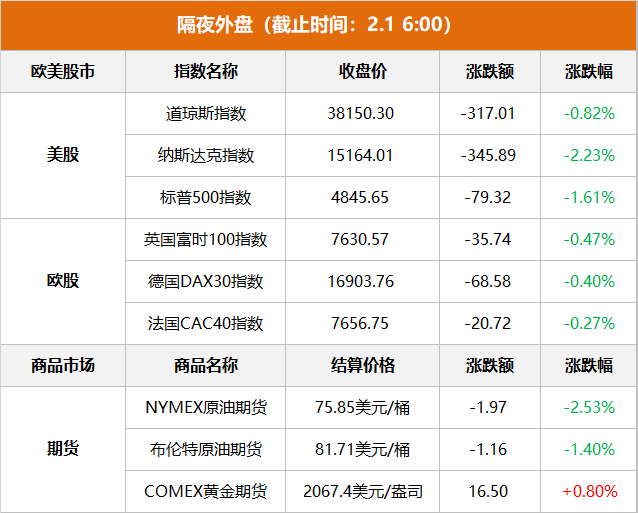 商品市场:国际油价下跌,截至当天收盘,纽约商品交易所3月交货的轻质原油期货价格下跌1.97美元,收于每桶75.85美元,跌幅为2.53%;3月交货的伦敦布伦特原油期货价格下跌1.16美元,收于每桶81.71美元,跌幅为1.40%。纽约商品交易所黄金期货市场交投最活跃的4月黄金期价1月31日上涨16.5美元,收于每盎司2067.4美元,涨幅为0.80%。
