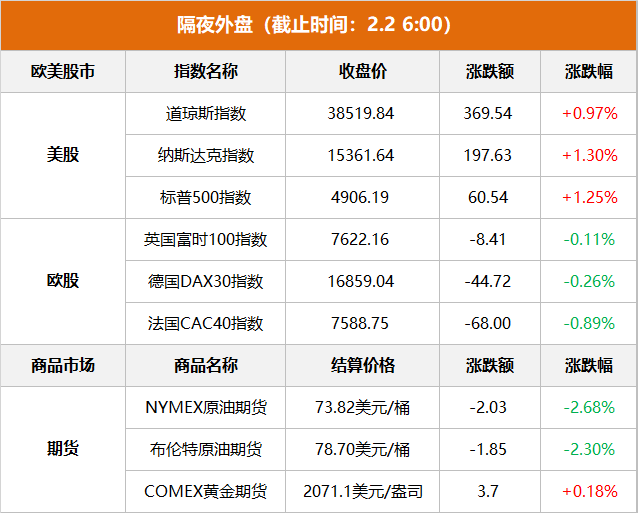 美股市场:美股三大指数周四集体收涨,截止收盘,道指涨369.54点,涨幅为0.97%,报38519.84点,创收盘新高;纳指涨197.63点,涨幅为1.30%,报15361.64点;标普500指数涨60.54点,涨幅为1.25%,报4906.19点。周三美联储维持利率不变,但暗示3月份降息的可能性不大。本周市场焦点转移至周五的非农就业数据。