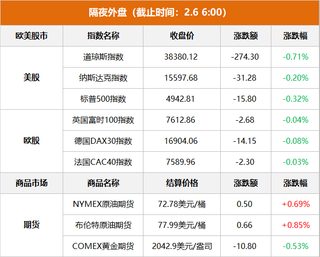 商品市场:国际油价上涨,截至当天收盘,纽约商品交易所3月交货的轻质原油期货价格上涨50美分,收于每桶72.78美元,涨幅为0.69%;4月交货的伦敦布伦特原油期货价格上涨66美分,收于每桶77.99美元,涨幅为0.85%。纽约商品交易所黄金期货市场交投最活跃的5日下跌10.8美元,收于每盎司2042.9美元,跌幅为0.53%。