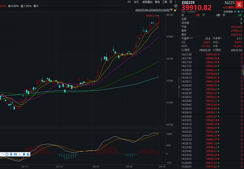 3月1日,日经225指数收涨1.9%,报39910.82点,盘中一度触及40000点整数关口,续创历史新高。今年年初以来,日经225指数涨幅超过19%,领跑全球主要股指。