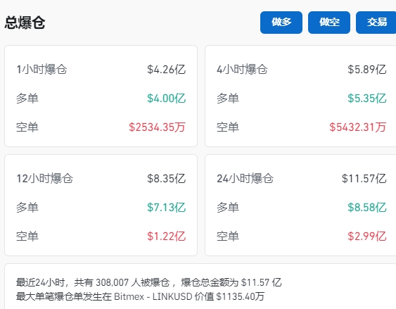 根据CoinGlass数据显示,随着比特币的大幅波动,全网加密货币24小时内有超30万人爆仓,爆仓总金额达11.57亿美元。最大单笔爆仓单发生在Bitmex-LINKUSD,价值1135.40万美元。