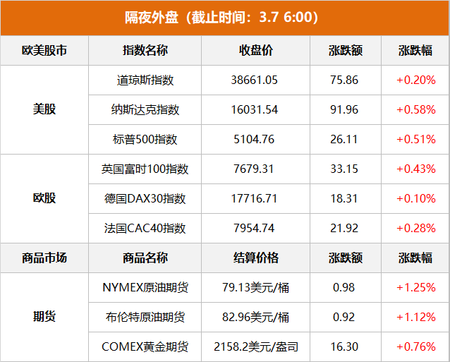 商品市场:国际油价上涨,截至当天收盘,纽约商品交易所4月交货的轻质原油期货价格上涨98美分,收于每桶79.13美元,涨幅为1.25%;5月交货的伦敦布伦特原油期货价格上涨92美分,收于每桶82.96美元,涨幅为1.12%。纽约商品交易所黄金期货市场交投最活跃的4月黄金期价6日上涨16.3美元,收于每盎司2158.2美元,涨幅为0.76%。