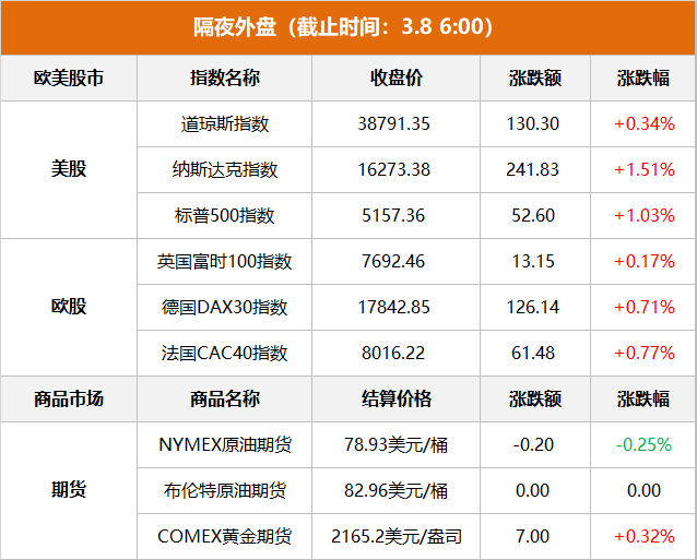 商品市场:美油下跌,截至当天收盘,纽约商品交易所4月交货的轻质原油期货价格下跌20美分,收于每桶78.93美元,跌幅为0.25%;5月交货的伦敦布伦特原油期货价格收于每桶82.96美元,与前一交易日持平。纽约商品交易所黄金期货市场交投最活跃的4月黄金期价7日上涨7美元,收于每盎司2165.2美元,涨幅为0.32%。