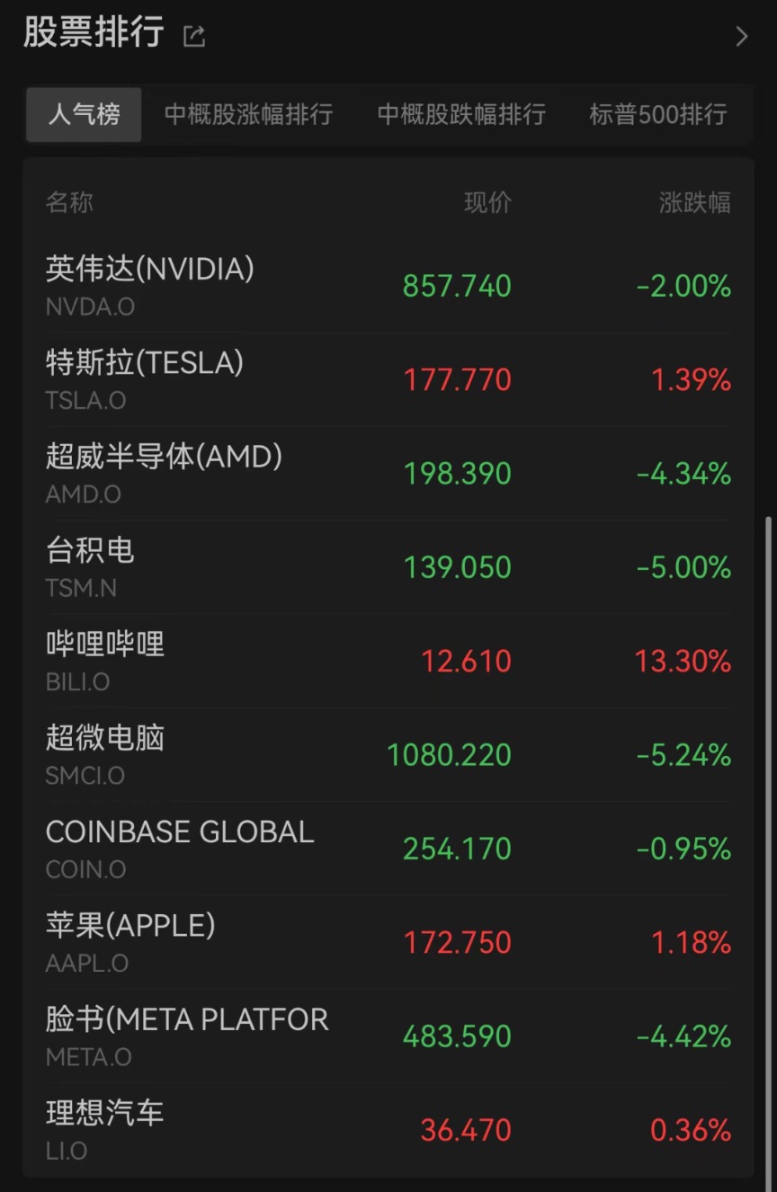 芯片股普遍下跌,台积电下跌5%,超威半导体跌逾4%,阿斯麦跌逾3%,英伟达下跌2%,英特尔涨近2%。