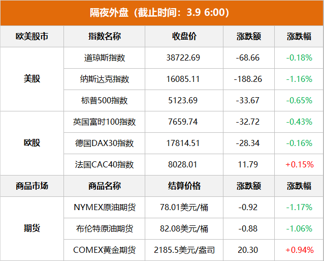 美股市场:美股三大指数收跌,纳指跌超1%。截至收盘,道指下跌68.66点,收于38722.69点,跌幅为0.18%;标准普尔500种股票指数下跌33.67点,收于5123.69点,跌幅为0.65%;纳斯达克综合指数下跌188.26点,收于16085.11点,跌幅为1.16%。本周,道指累跌0.93%,纳指累跌1.17%,标普500指数累跌0.26%。