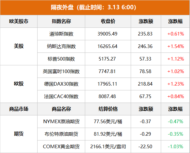 美股市场:美股三大指数集体收涨,标普创收盘历史新高,截止收盘,道琼斯工业平均指数比前一交易日上涨235.83点,收于39005.49点,涨幅为0.61%;纳斯达克综合指数上涨246.36点,收于16265.64点,涨幅为1.54%;标准普尔500种股票指数上涨57.33点,收于5175.27点,涨幅为1.12%。美国2月CPI同比增长3.2%,环比增长0.4%,均连续第二个月加快增长,但增速均符合预期,2月核心CPI则连续第二个月超预期增长,同比增3.8%,环比增0.4%、为八个月来最高增速。