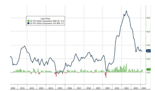 据券商中国,北京时间3月12日晚间,美国劳工部公布了美国2024年2月CPI数据,其中显示,美国2月CPI同比上升3.2%,为去年12月以来新高,高于预期的3.1%,前值为3.1%;美国2月CPI环比上升0.4%,符合预期,但高出前值0.3%。