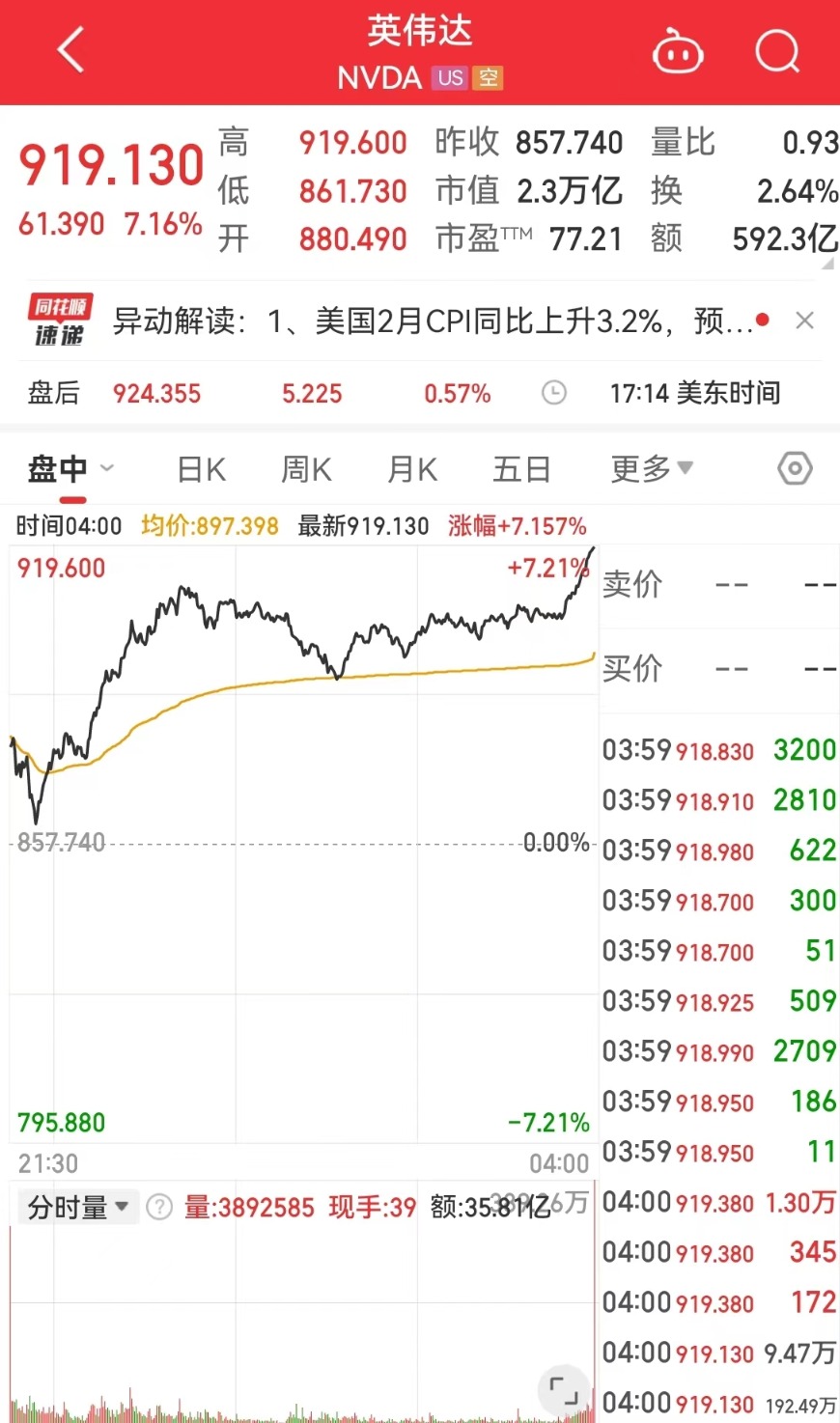 英伟达涨7.16%,报919.13美元,单日市值增加约1535亿美元(约合人民币11023亿元),总市值2.3万亿美元。