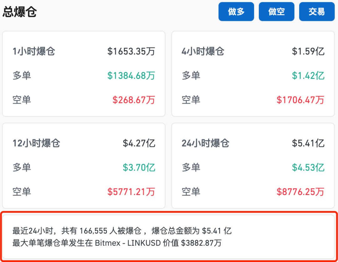 CoinGlass数据显示,最近24个小时内,虚拟货币市场共有16.6万投资者爆仓,爆仓总金额达5.41亿美元(约合人民币39亿元)。