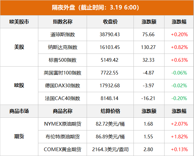 美股市场:美股三大指数集体上涨,截止收盘,道琼斯工业平均指数比前一交易日上涨75.66点,收于38790.43点,涨幅为0.20%;纳斯达克综合指数上涨130.27点,收于16103.45点,涨幅为0.82%;标准普尔500种股票指数上涨32.33点,收于5149.42点,涨幅为0.63%。