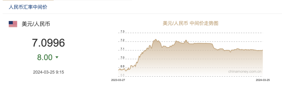 外汇交易中心数据显示,3月25日,人民币对美元汇率中间价报7.0996元,较前一交易日调升8基点。3月以来,该中间价累计调升40个基点。