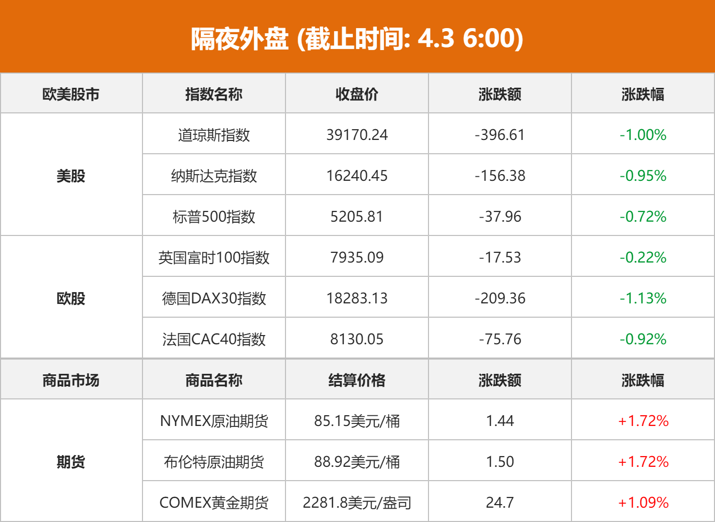 美股市场:美股三大指数集体收跌,盘中跌幅均超过1%,截止收盘,道琼斯工业平均指数比前一交易日下跌396.61点,收于39170.24点,跌幅为1.00%;纳斯达克综合指数下跌156.38点,收于16240.45点,跌幅为0.95%;标准普尔500种股票指数下跌37.96点,收于5205.81点,跌幅为0.72%。