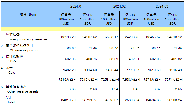 国家外汇管理局统计数据显示,截至2024年3月末,我国外汇储备规模为32457亿美元,较2月末上升198亿美元,升幅为0.62%。