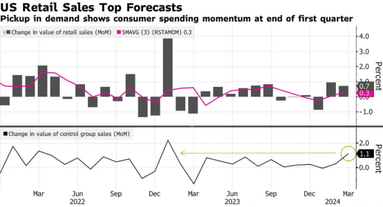 对照组销售额(用于计算美国国内生产总值)增长了1.1%,为去年初以来的最高水平。该数据不包括食品服务、汽车经销商、建筑材料商店和加油站。这意味着,美国第一季度GDP可能强劲。