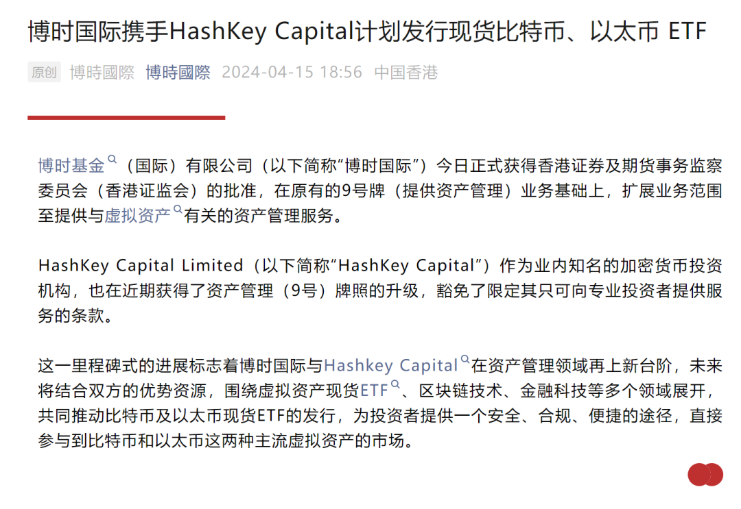 4月15日,华夏基金(香港)、博时国际、嘉实国际等三家基金公司子公司均宣布,计划发行能投资于现货比特币和现货以太币的ETF产品。这距离上周二获得虚拟资产资管服务资格仅一周时间。