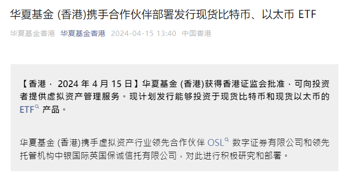 4月15日,华夏基金(香港)称,获得香港证监会批准,可向投资者提供虚拟资产管理服务,现计划发行能够投资于现货比特币和现货以太币的ETF产品。