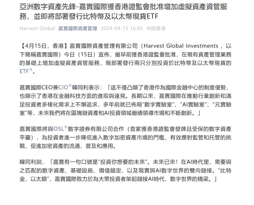 此外,嘉实国际今日也宣布,早前香港监会批准,在现有资产管理业务的基础上增加虚拟资产资管服务,现部署发行两只分别投资于比特币及以太币现货的ETF。