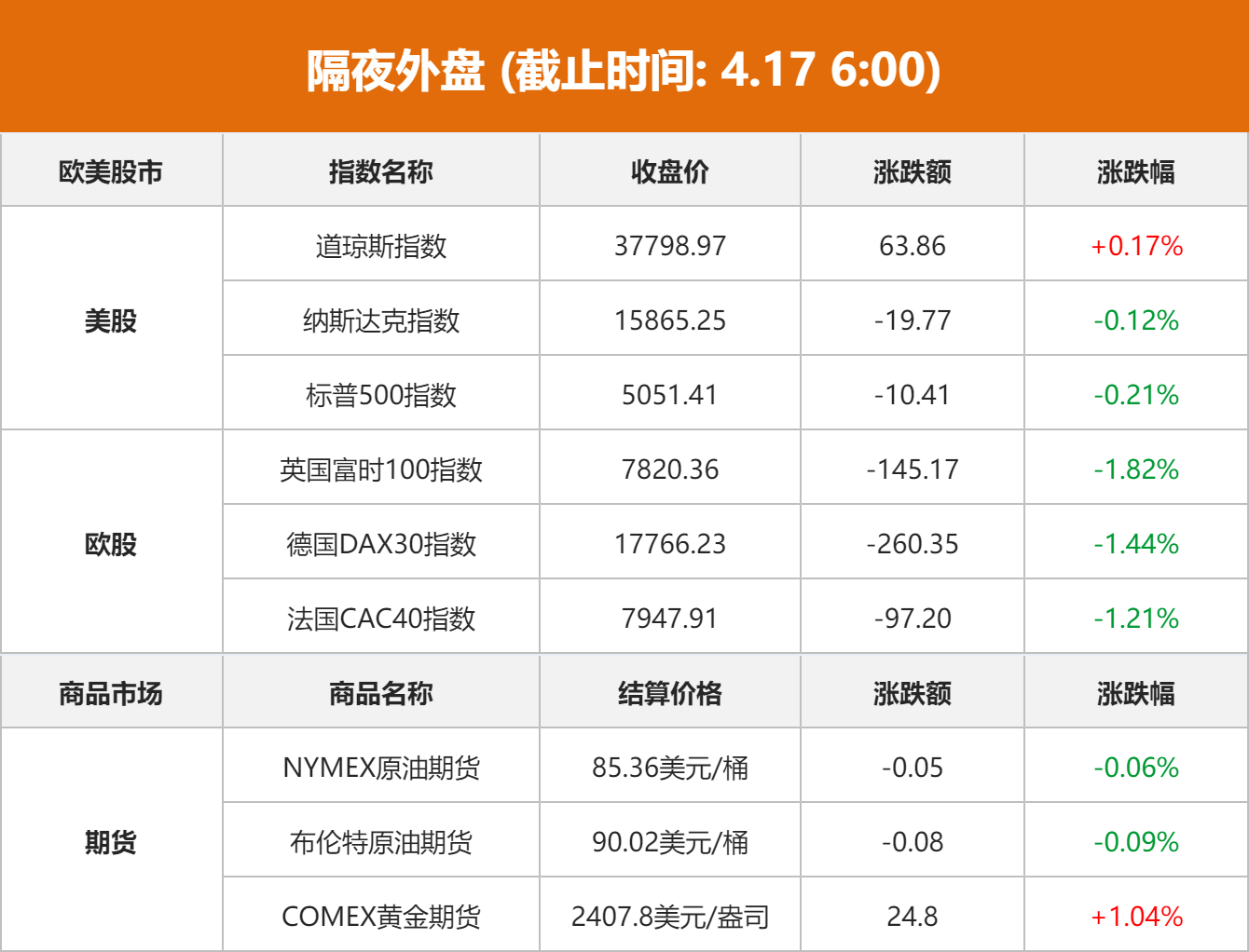 商品市场:国际油价微跌,截至收盘,纽约商品交易所5月交货的轻质原油期货价格下跌5美分,收于每桶85.36美元,跌幅为0.06%;6月交货的伦敦布伦特原油期货价格下跌8美分,收于每桶90.02美元,跌幅为0.09%。国际金价上涨,COMEX黄金期货6月合约结算价涨24.8美元,涨幅1.04%,报2407.8美元/盎司,结算价续创新高。