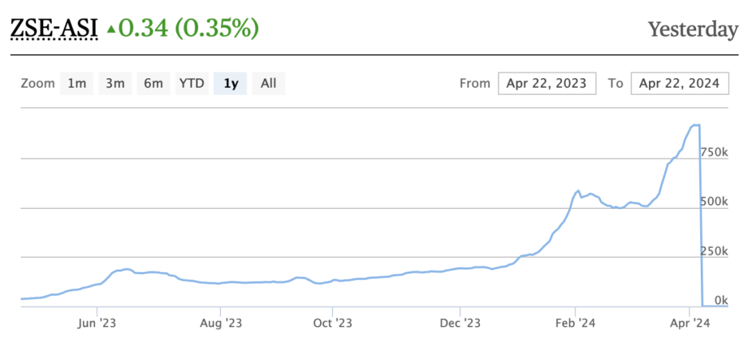 自2024年4月5日津巴布韦央行推出ZiG(津巴布韦新货币“津巴布韦金”的简称)以来,津巴布韦证券交易所全股指数出现罕见暴跌。