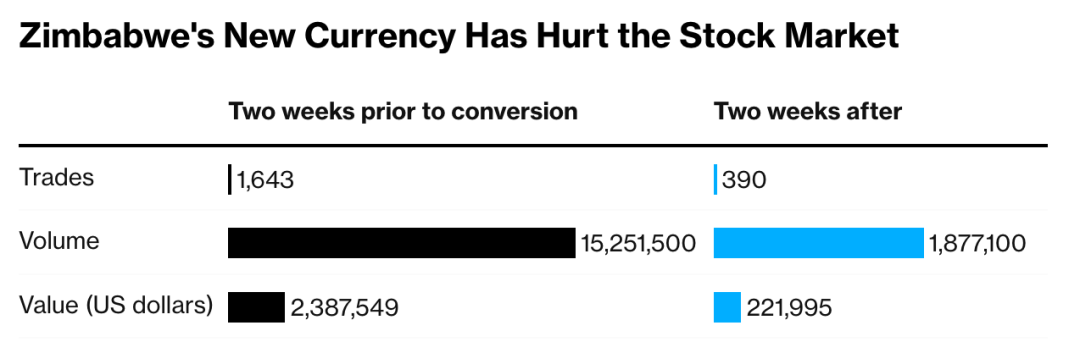 哈拉雷经纪公司的研究主管劳埃德·姆洛什瓦表示,交易量的下降导致一些经纪公司的收入下降了至少50%,其中大多数经纪公司的盈利都受到了巨大打击。他表示,对于股票经纪人来说,新货币产生了多米诺骨牌效应,导致日均成交量较低,进而对股票经纪行业产生连锁反应。