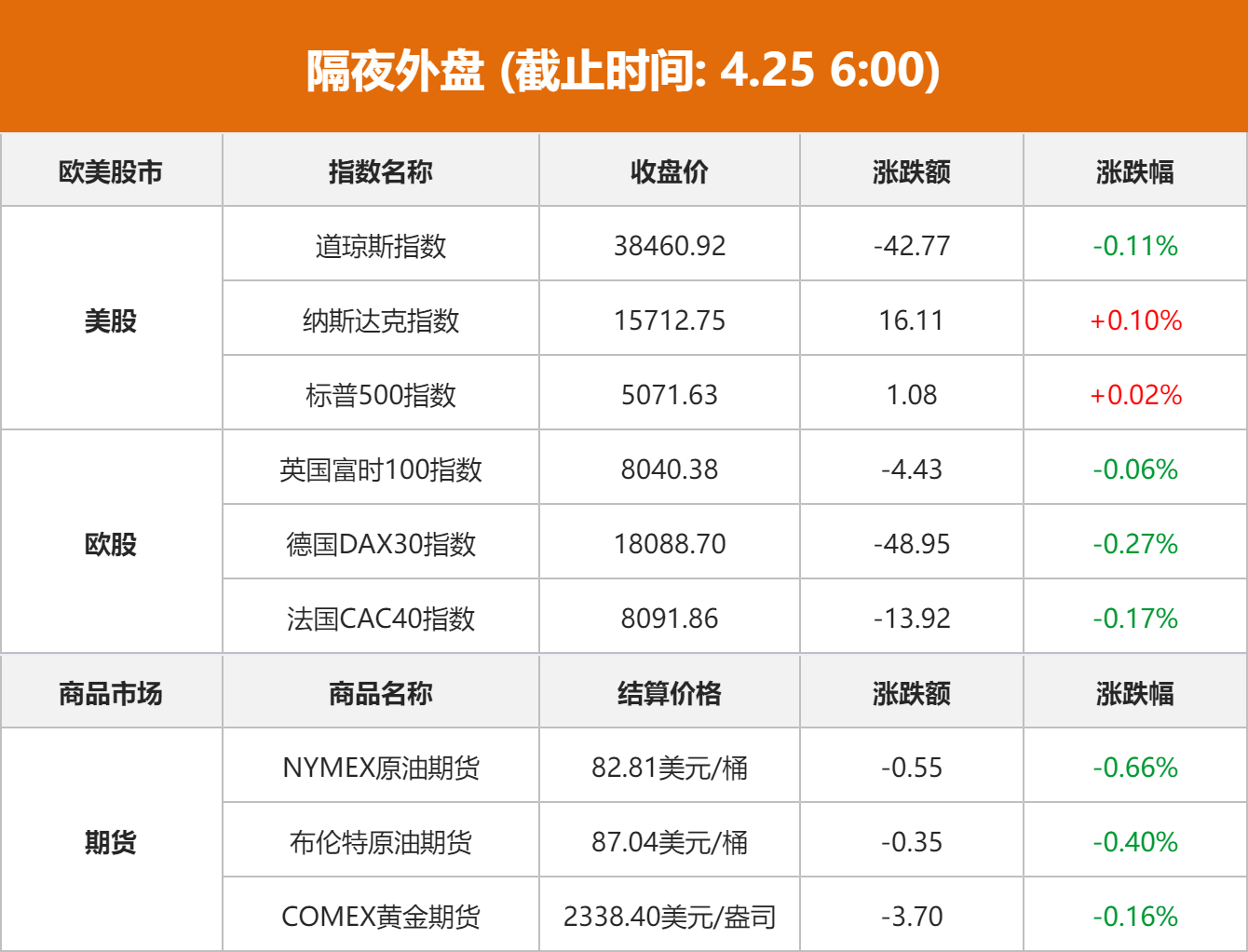 商品市场:国际油价24日下跌。截至当天收盘,纽约商品交易所6月交货的轻质原油期货价格下跌55美分,收于每桶82.81美元,跌幅为0.66%;6月交货的伦敦布伦特原油期货价格下跌40美分,收于每桶88.02美元,跌幅为0.45%。国际金价收跌,Comex黄金期货主力合约下跌3.7美元,跌幅0.16%,结算价2338.4美元/盎司。