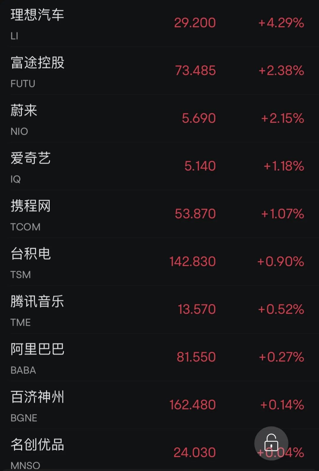 跌幅方面,达达集团跌5.53%,万国数据跌3.55%,盛大科技跌3.54%,贝壳跌2.72%,知乎跌2.3%,雾芯科技跌1.92%。