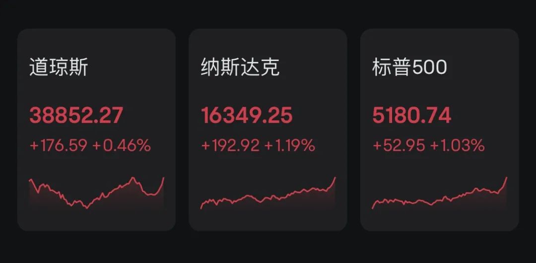 美股三大股指周一收高,道指涨176.59点,涨幅为0.46%,报38852.27点;纳指涨192.92点,涨幅为1.19%,报16349.25点;标普500指数涨52.95点,涨幅为1.03%,报5180.74点。
