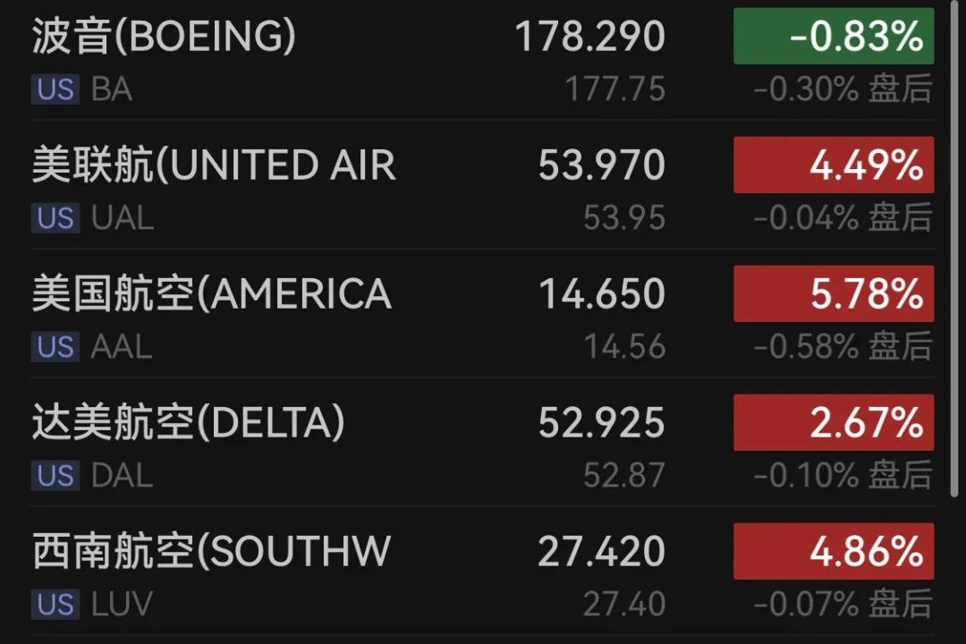 其他航空股多数上涨,美国航空涨5.78%,达美航空涨2.67%,西南航空涨4.86%,美联航涨4.49%。